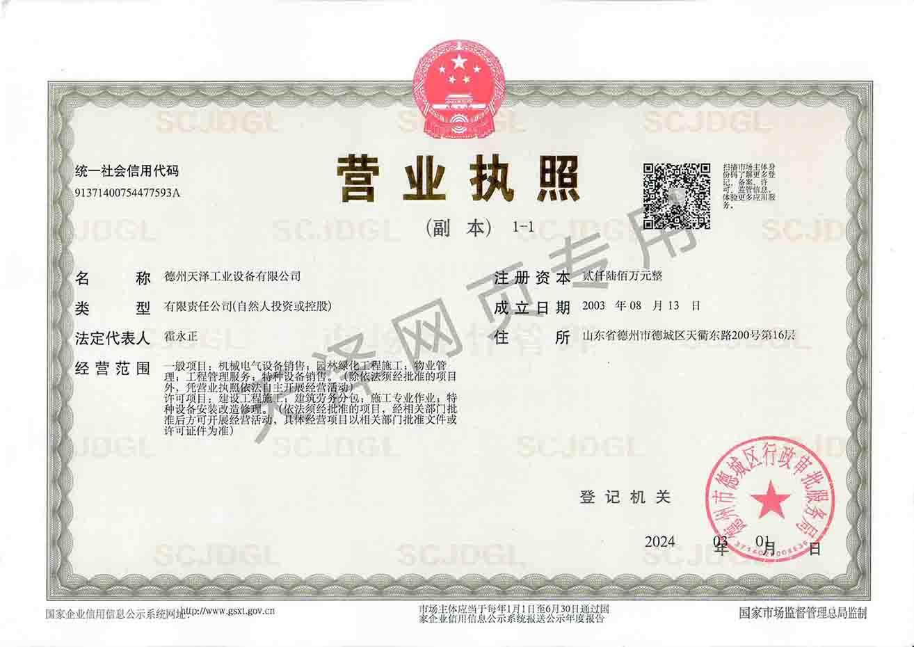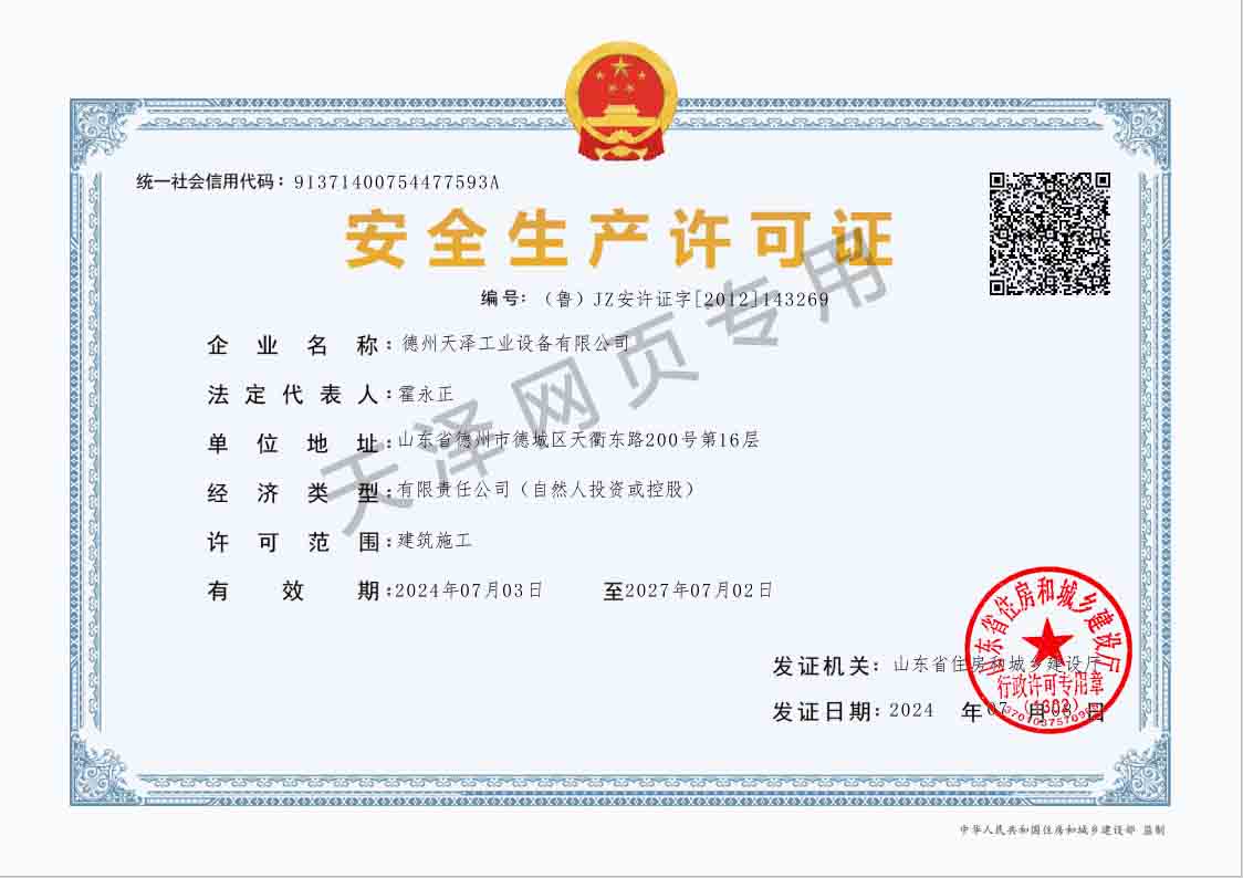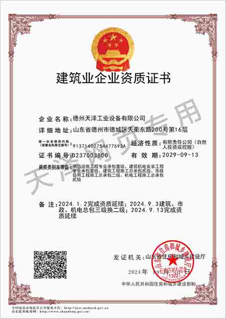 德州天澤工業(yè)設備有限公司成立于2003年(前身為德州天元集團天明工業(yè)設備安裝公司),經(jīng)過20多年的發(fā)展,現(xiàn)成長為擁有職工600余人,各類專業(yè)技術人員近300余人,年生產(chǎn)能力兩億元以上,以建筑機電安裝工程、消防設施安裝工程施工為主,集建筑工程施工、市政工程施工、建筑智能化工程施工、園林綠化工程施工、工程管理服務、物業(yè)管理、電氣機械設備銷售等多元化經(jīng)營于一體的綜合型企業(yè)。2005年,企業(yè)按照國際標準建立的質量管理體系,通過了ISO質量管理體系認證、環(huán)境管理體系認證、職業(yè)健康安全管理體系認證。施工工程遍布山東、河北、四川、江蘇等地,最具代表性的工程有:山東省德州市百腦匯資訊廣場機電安裝工程、德州經(jīng)濟開發(fā)區(qū)天元大廈機電安裝工程、陵城區(qū)人民醫(yī)院機電安裝工程、德州金魯班大廈機電安裝工程、河北故城金辰小區(qū)機電安裝工程、北川地震災后援建工程等。多年來,公司始終堅持“以人為本,建精品工程,創(chuàng)行業(yè)品牌”的經(jīng)營理念,先后榮獲。ㄊ校┘壧┥奖⑻旄Ⅳ敯脖泉勴棧陥蟾鞣N功法、多項專利。